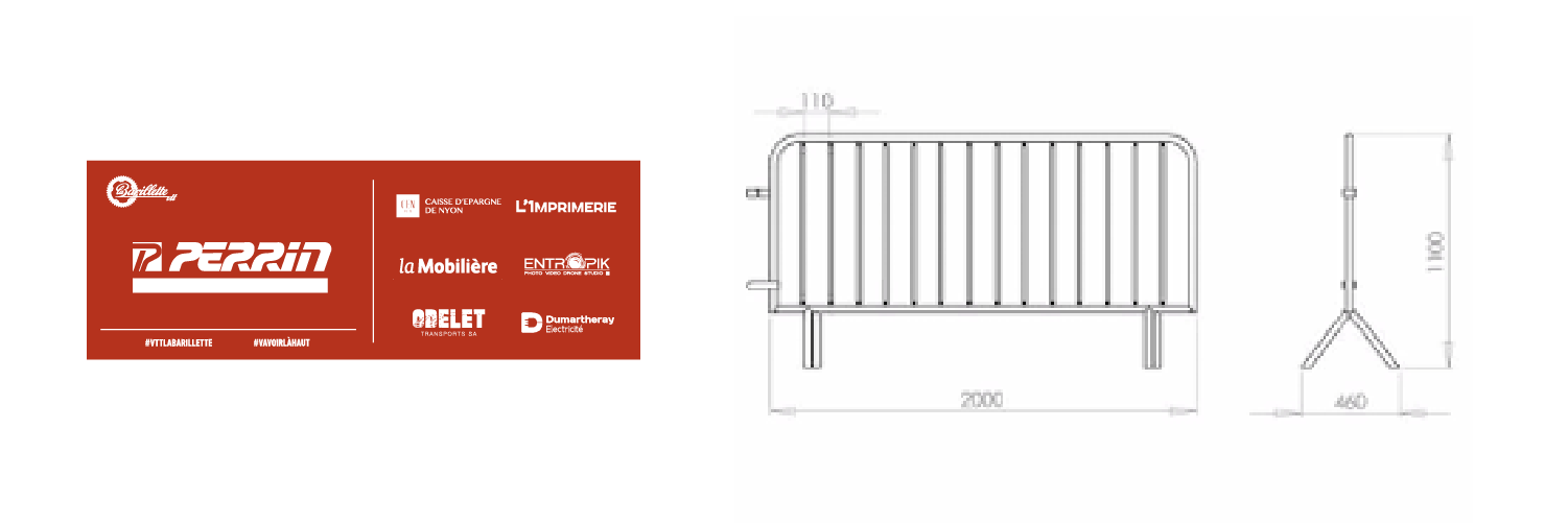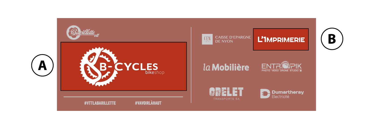 La surface d’un des emplacements B est d’environ 45x17cm. L’organisation choisit l’imposition du logo sur les banderoles.